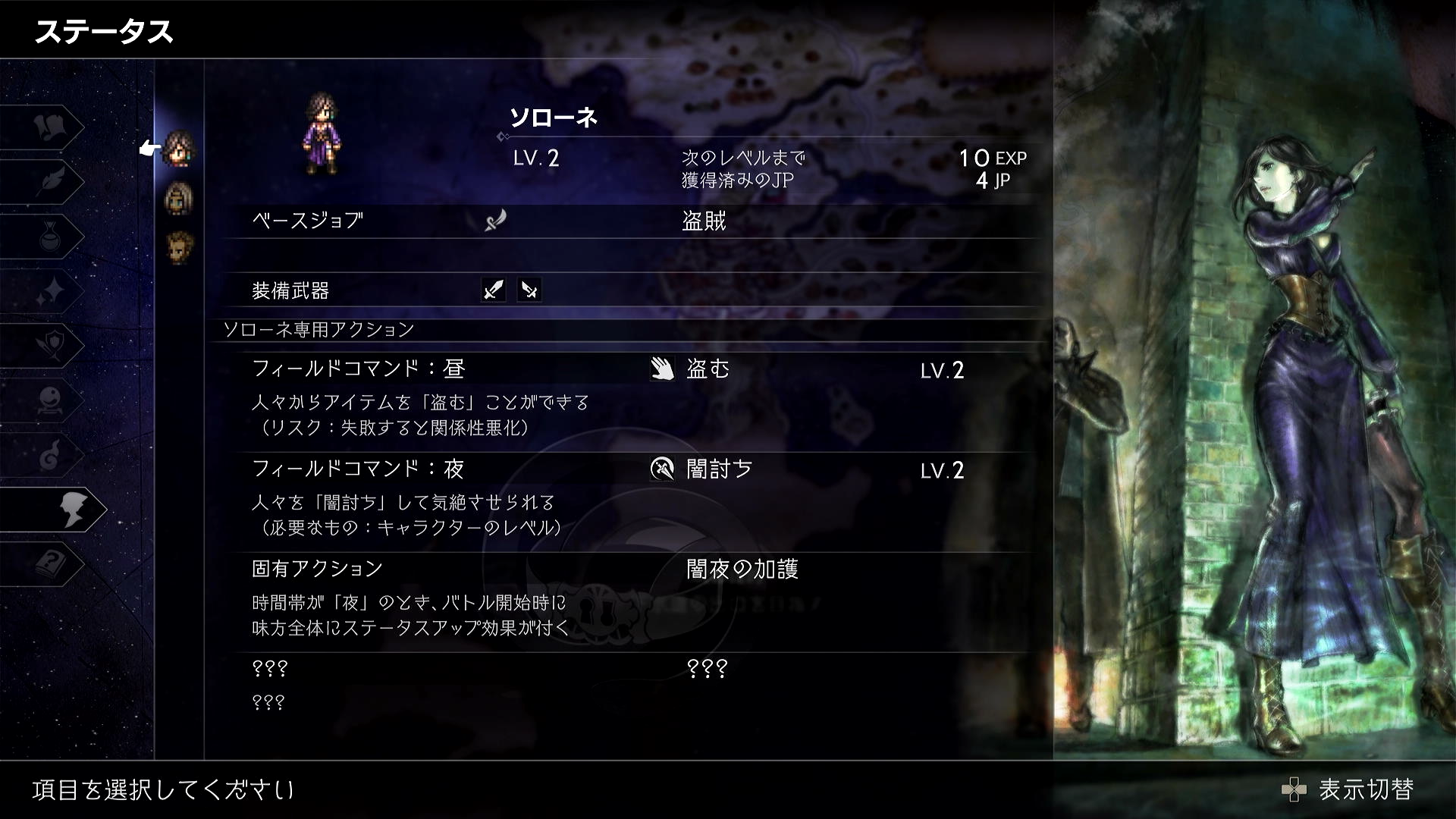 | 7 | 闇に生きる | 時間帯が夜のときのバトル終了時に獲得するEXPとJPが増加する。 |
